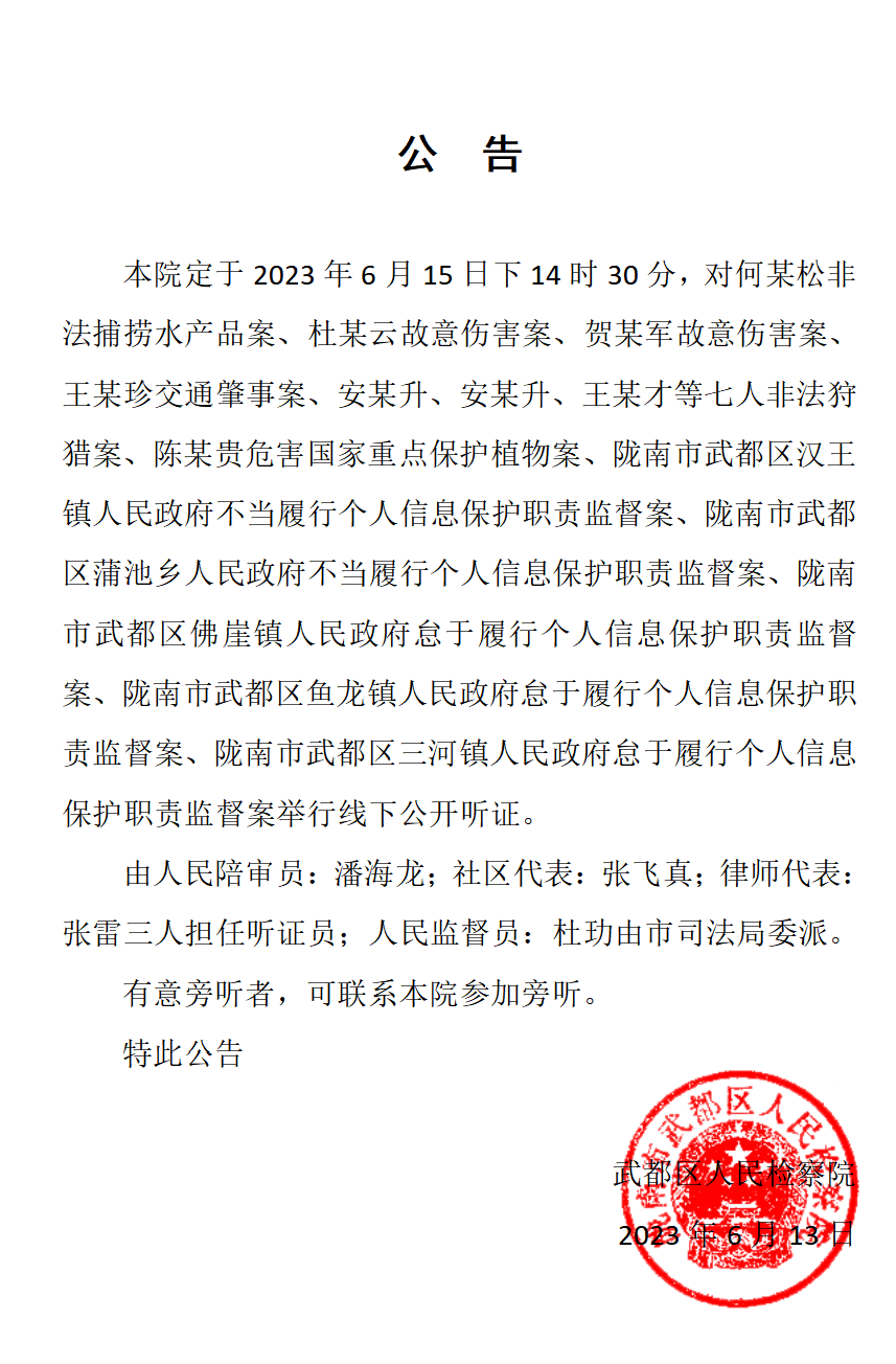 武都区人民检察院2023年度案件听证公告(第十五次)